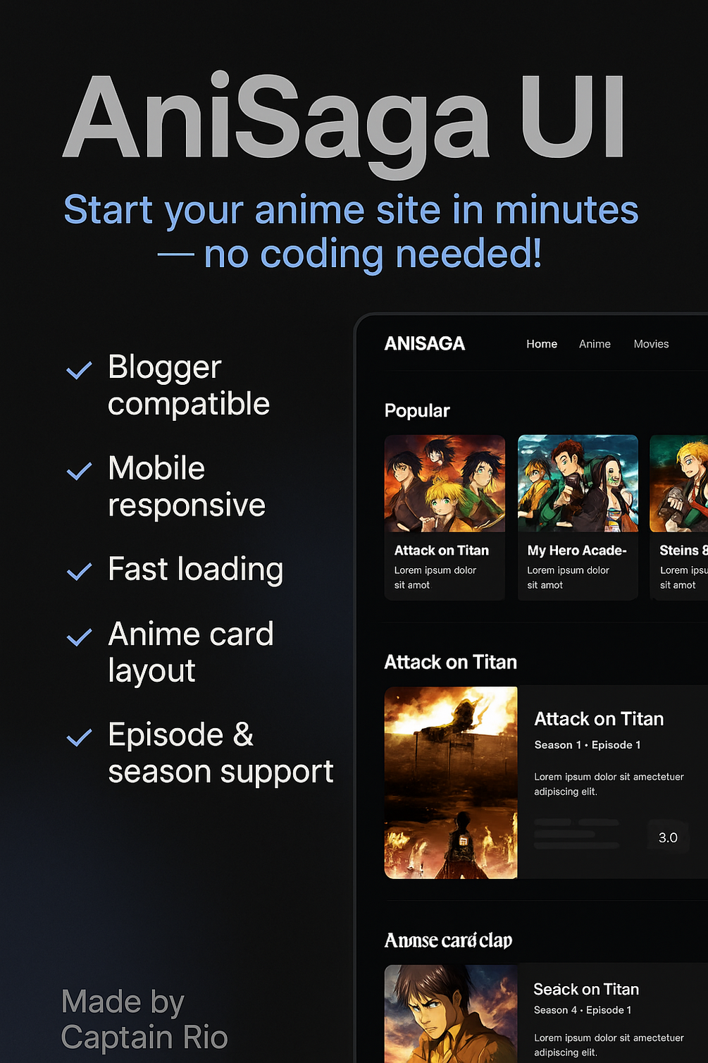 Level up your anime website with AniSaga UI — a clean, fast, and fully mobile-friendly Blogger template. Perfect for anime lovers who want to build an episode listing or streaming-style blog easily.